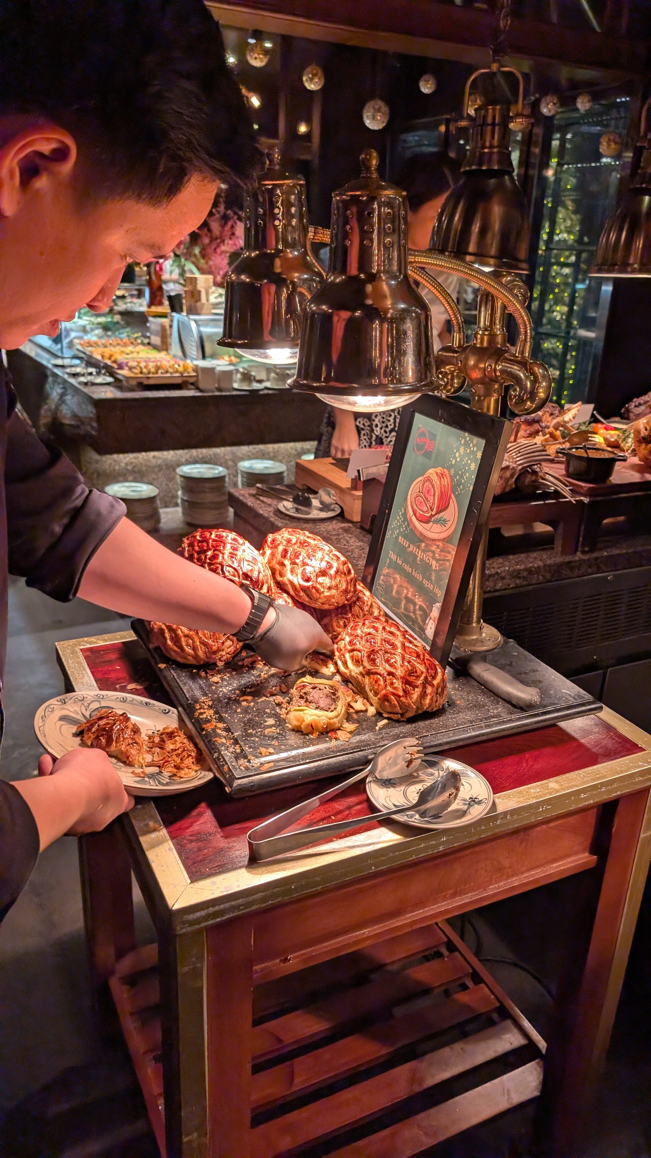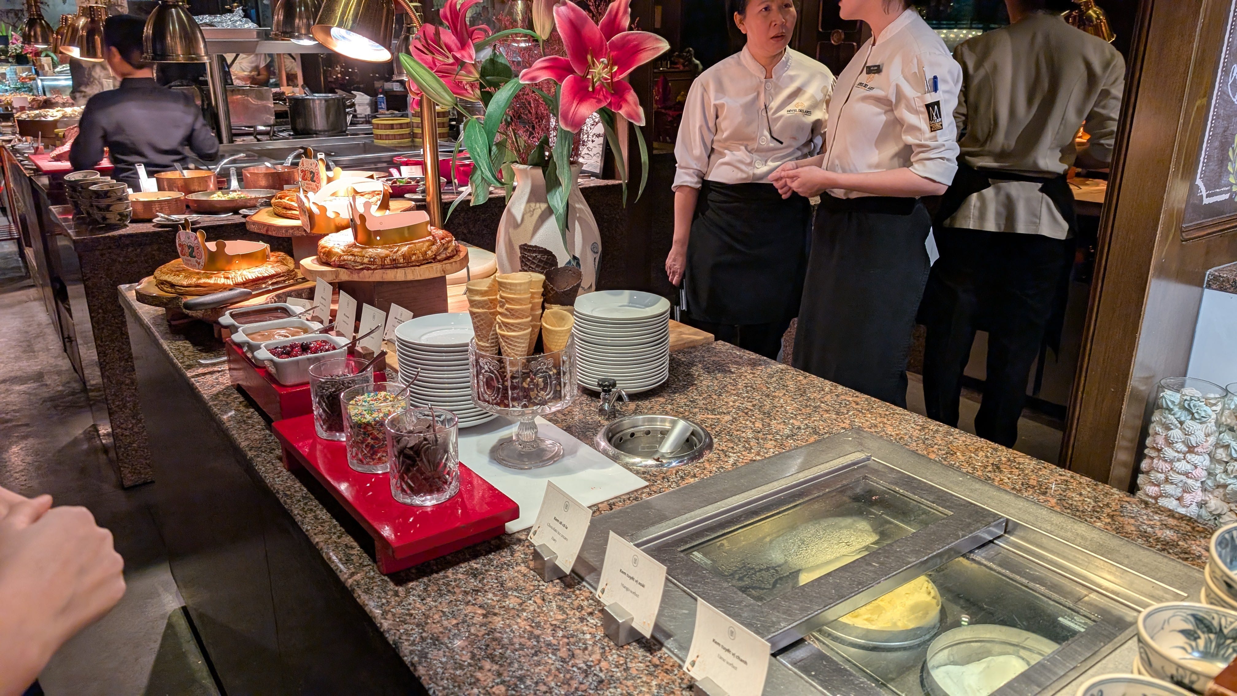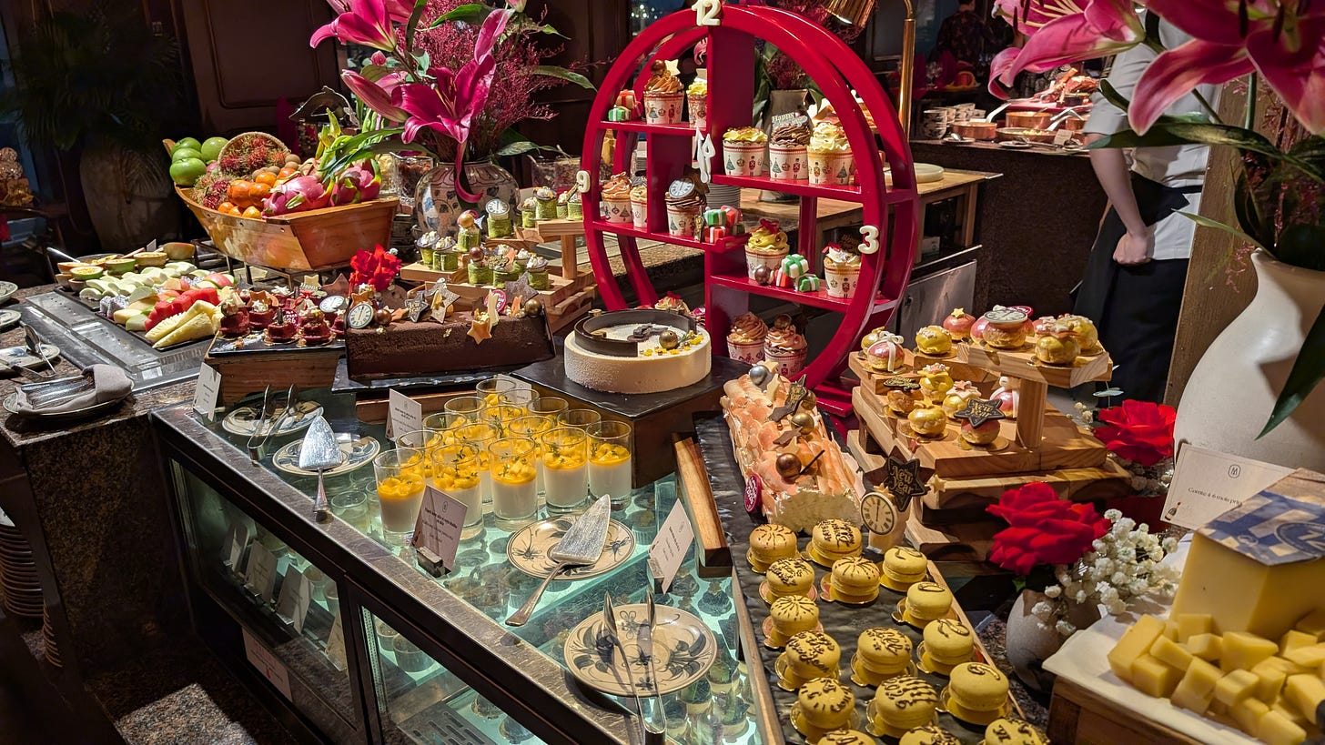 The other side offered an array of tropical fruit, matcha or red velvet petit fours, tiramisu, raspberry chocolate mousse, a chocolate log cake, passionfruit panna cotta, cupcakes, macarons, and cute little choux cremes decorated with tiny stars.