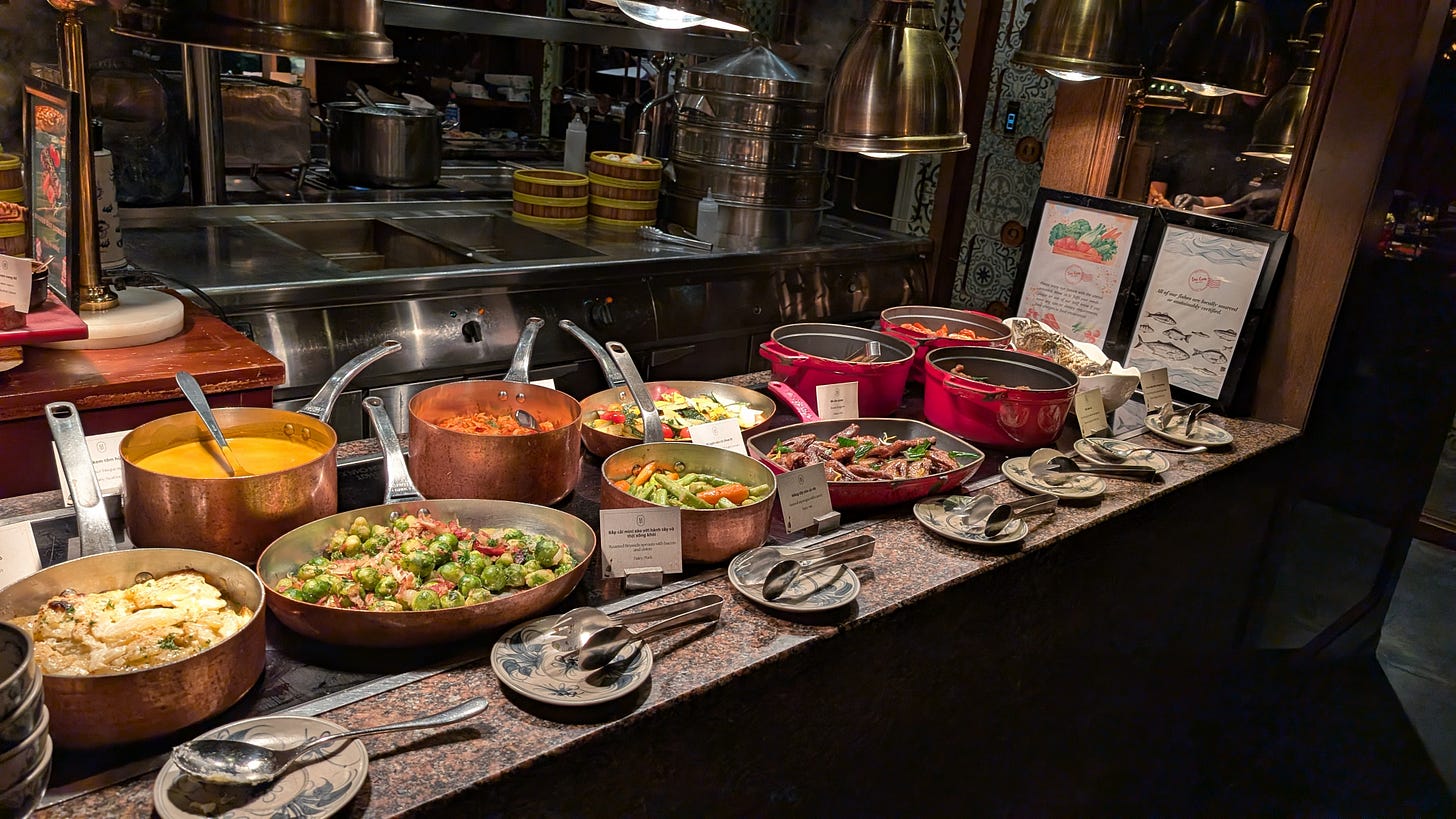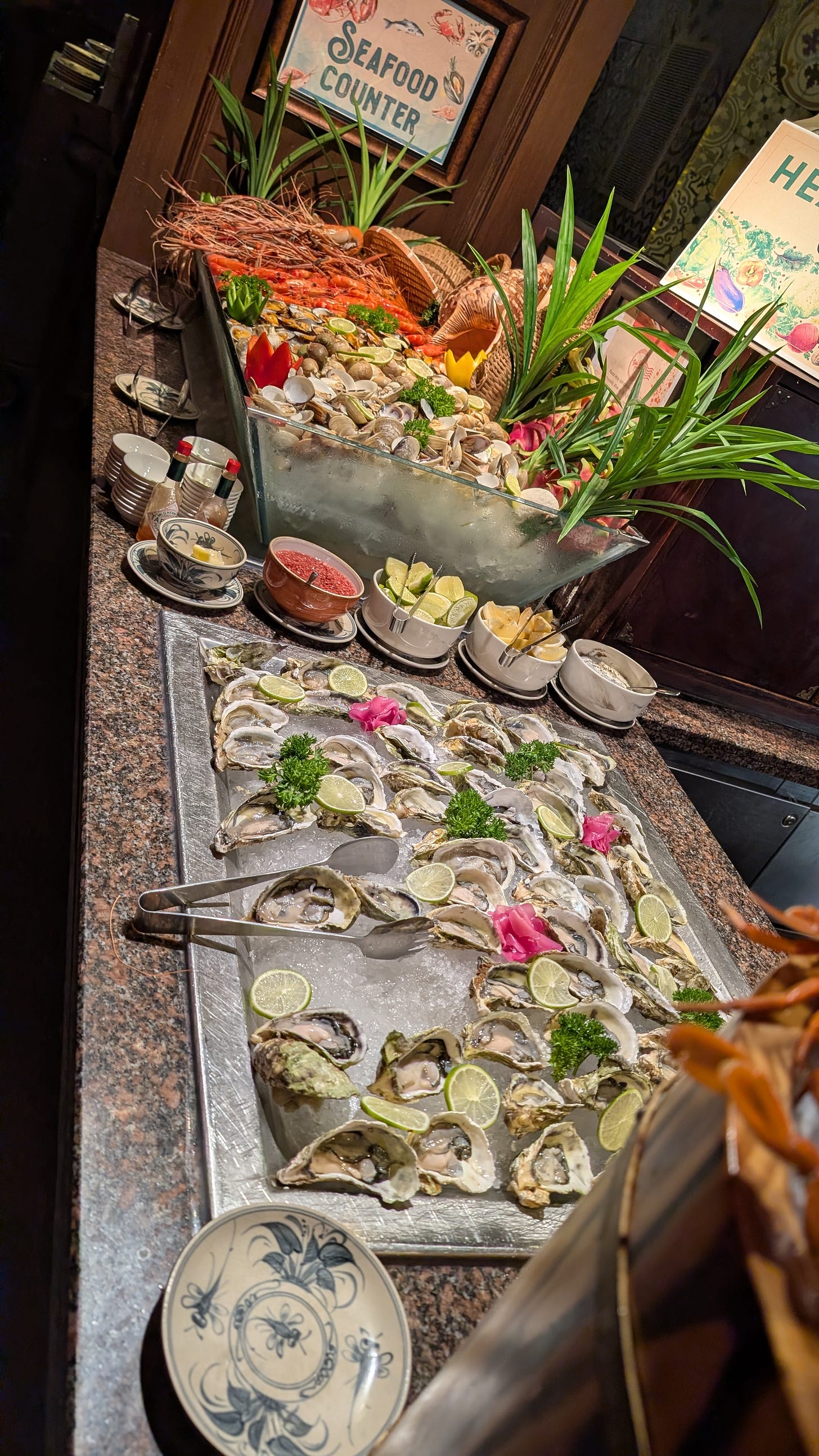 There was one last savory section with dishes including lobster bisque, potatoes gratinee, a steamed vegetable medley, roasted Brussels sprouts with pancetta, steamed asparagus, paella with shrimp, and a whole grouper steamed in ginger sauce.