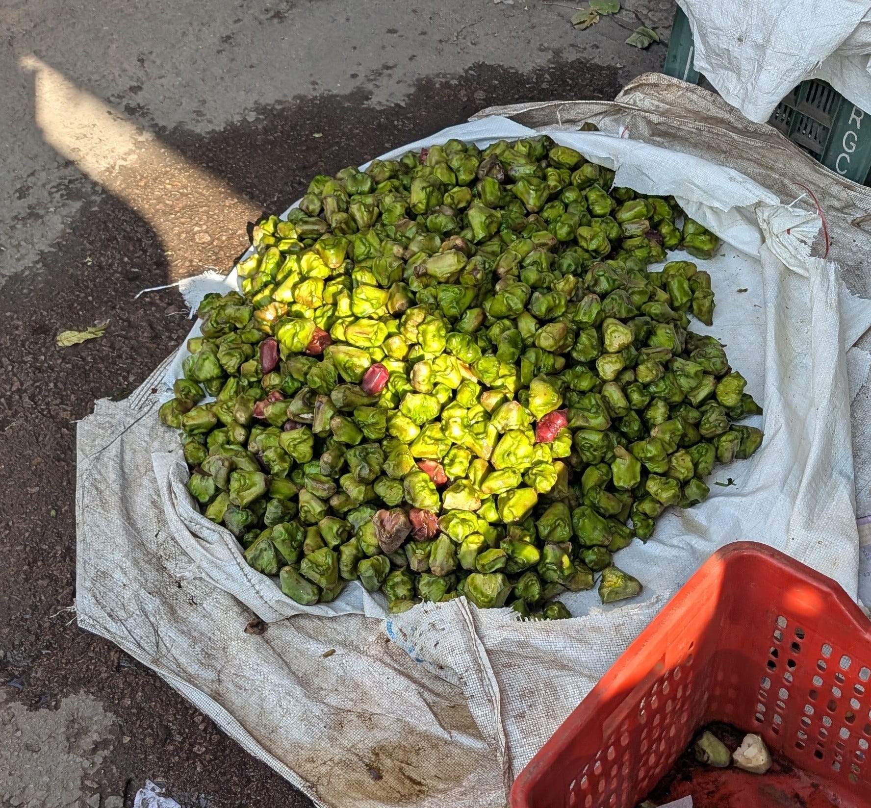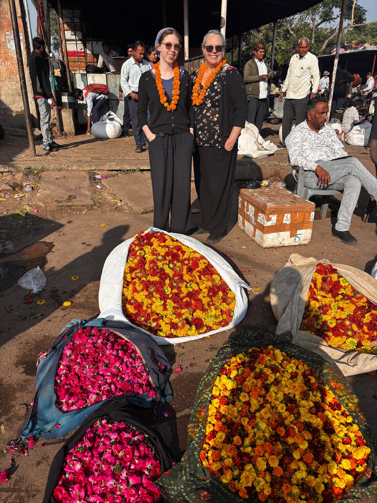 Then we entered the flower market. We were garlanded with marigolds and strewn with chrysanthemum and rose petals as we admired the vibrant blossoms for sale.