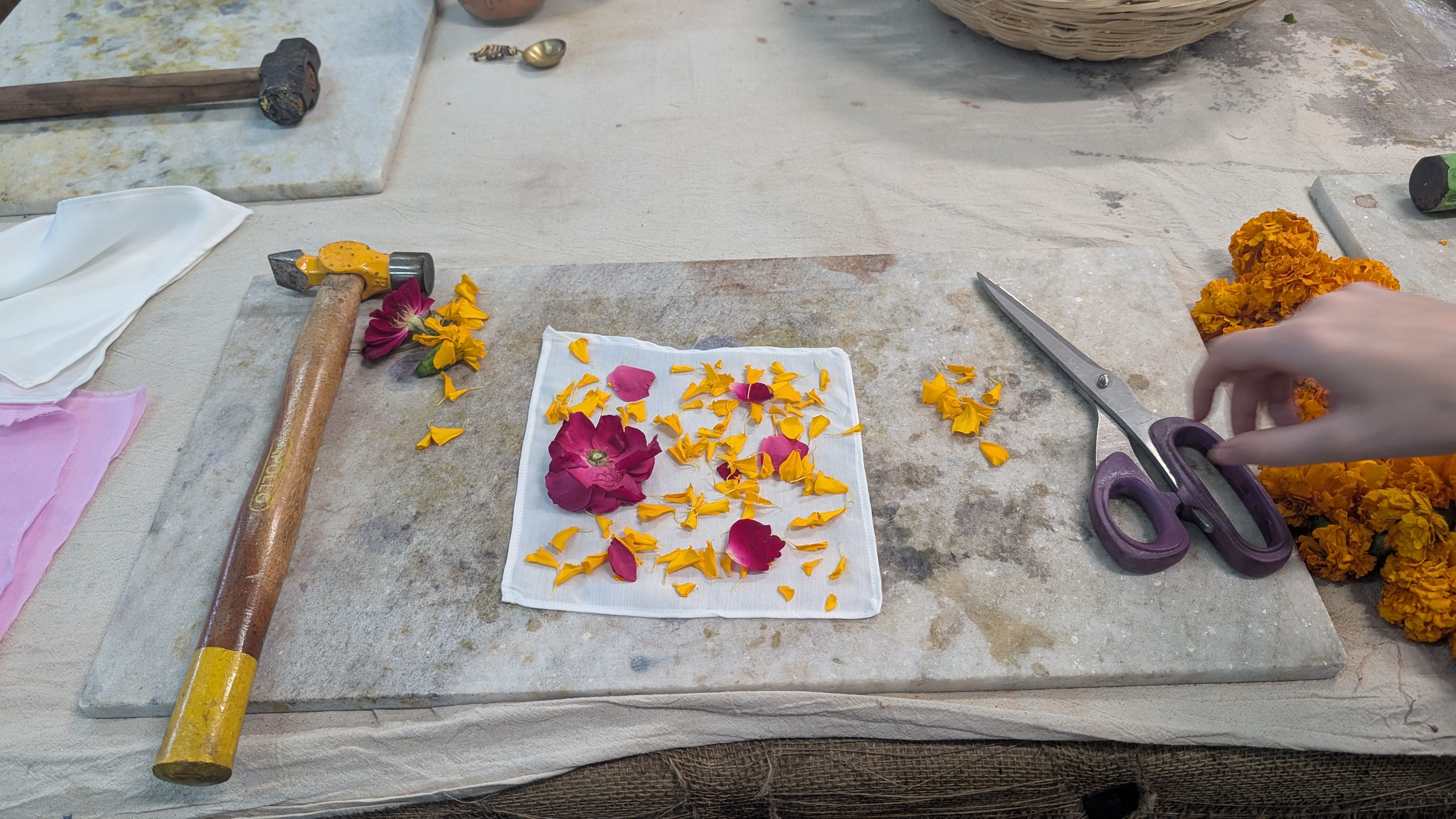 We got to try dying fabric with the flower garlands we'd gotten at the market. We arranged them on squares of cloth, covered them with another piece of fabric, then hammered the flowers to release their color.