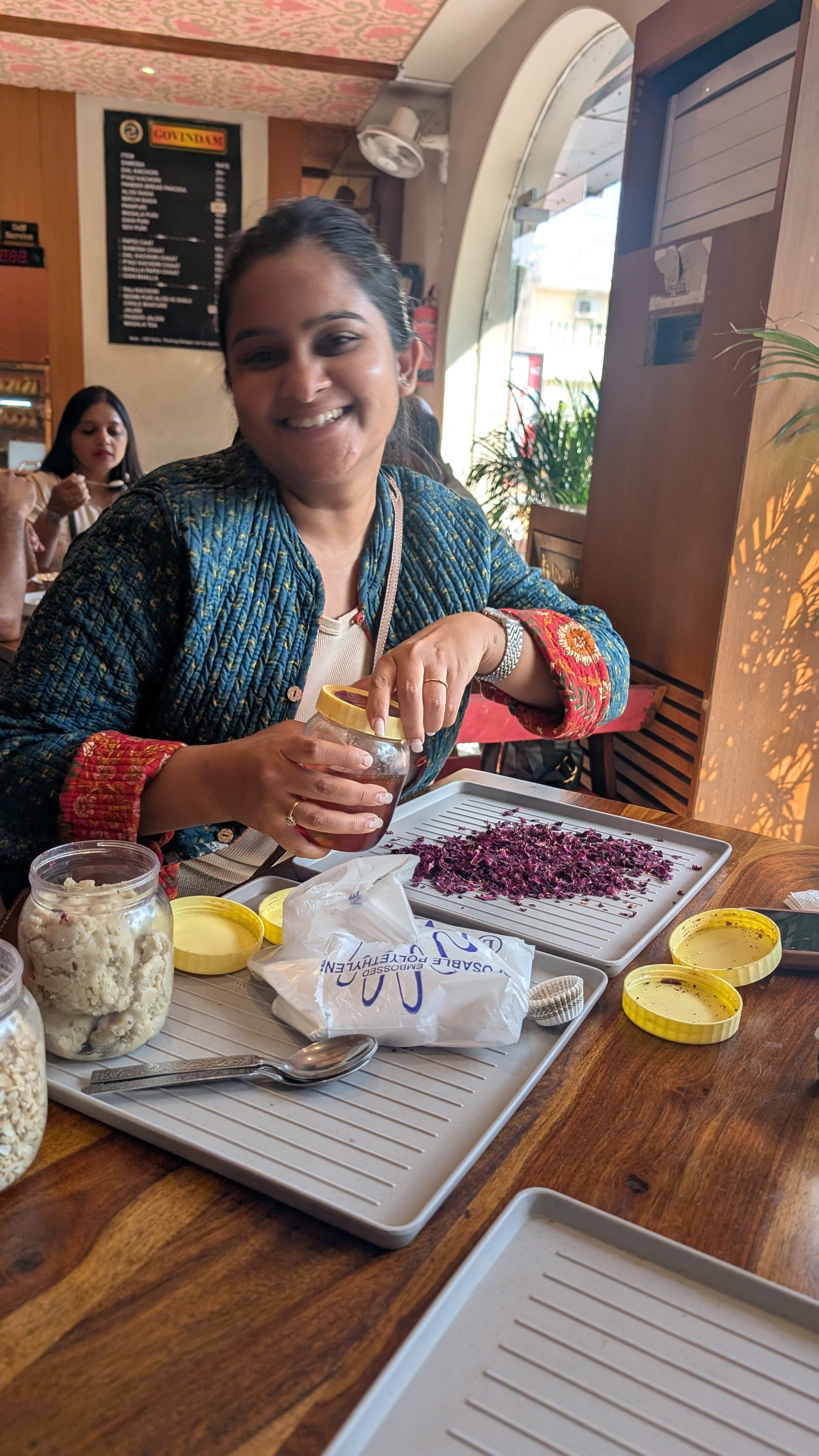 After our visit to the temple, Selva took us to a local shop selling traditional sweets for a demonstration of how flowers are used there. We got to knead together chopped cashews and honey with cashew paste and then roll balls of the sweet dough in the dried petals of the local roses. Neither of us love the flavor of rose, but the sweets were surprisingly tasty.