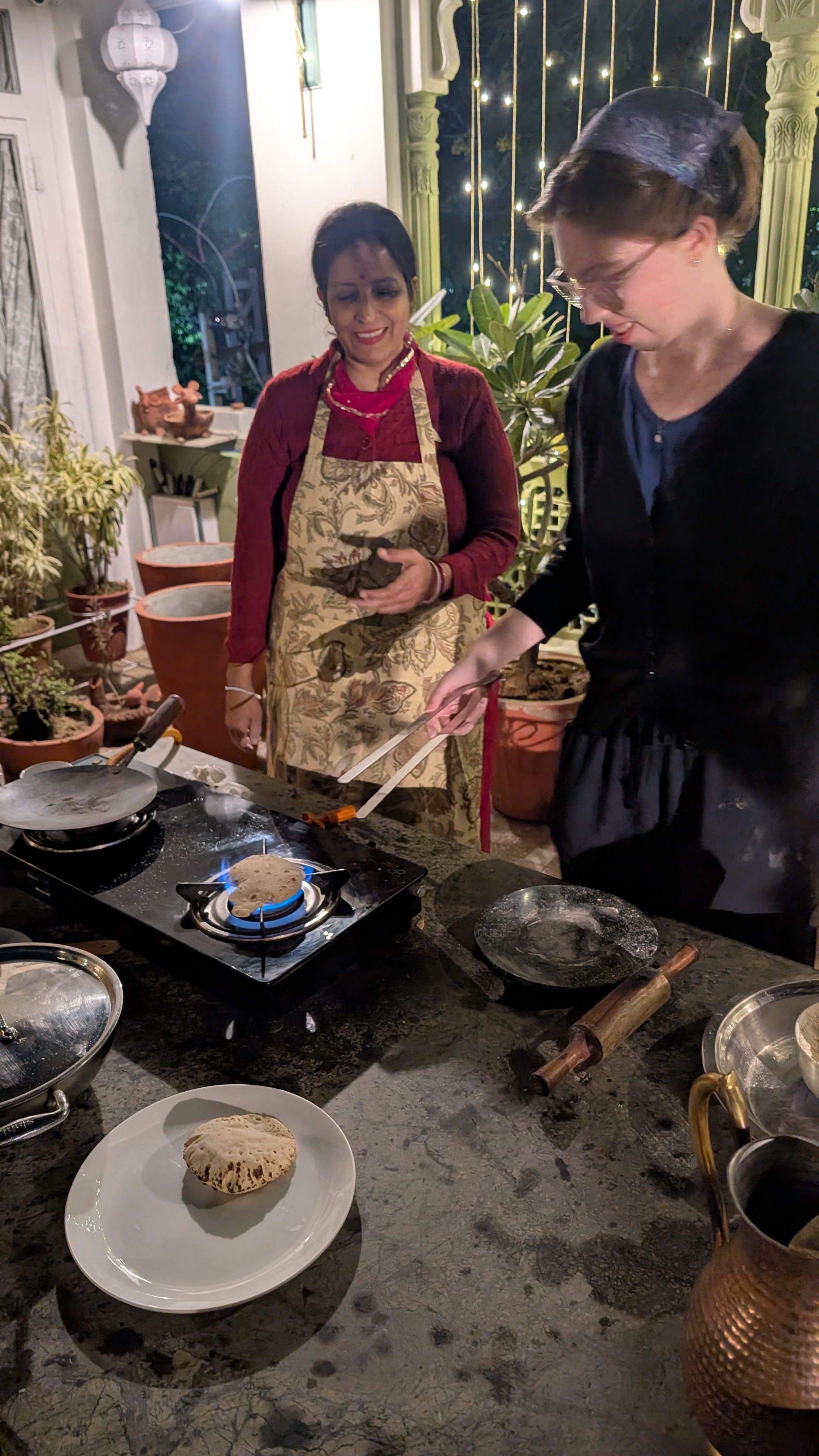 After a break at our hotel we headed to Ikaki Niwas, a small guest house offering cooking demonstrations and dinner with the family who run the place. Our host, Chandrika, let us help her in making sweet halva, papadam curry, and bread. Alice and I made chapattis, and Jason got to learn how to fill the dough to make a paratha.