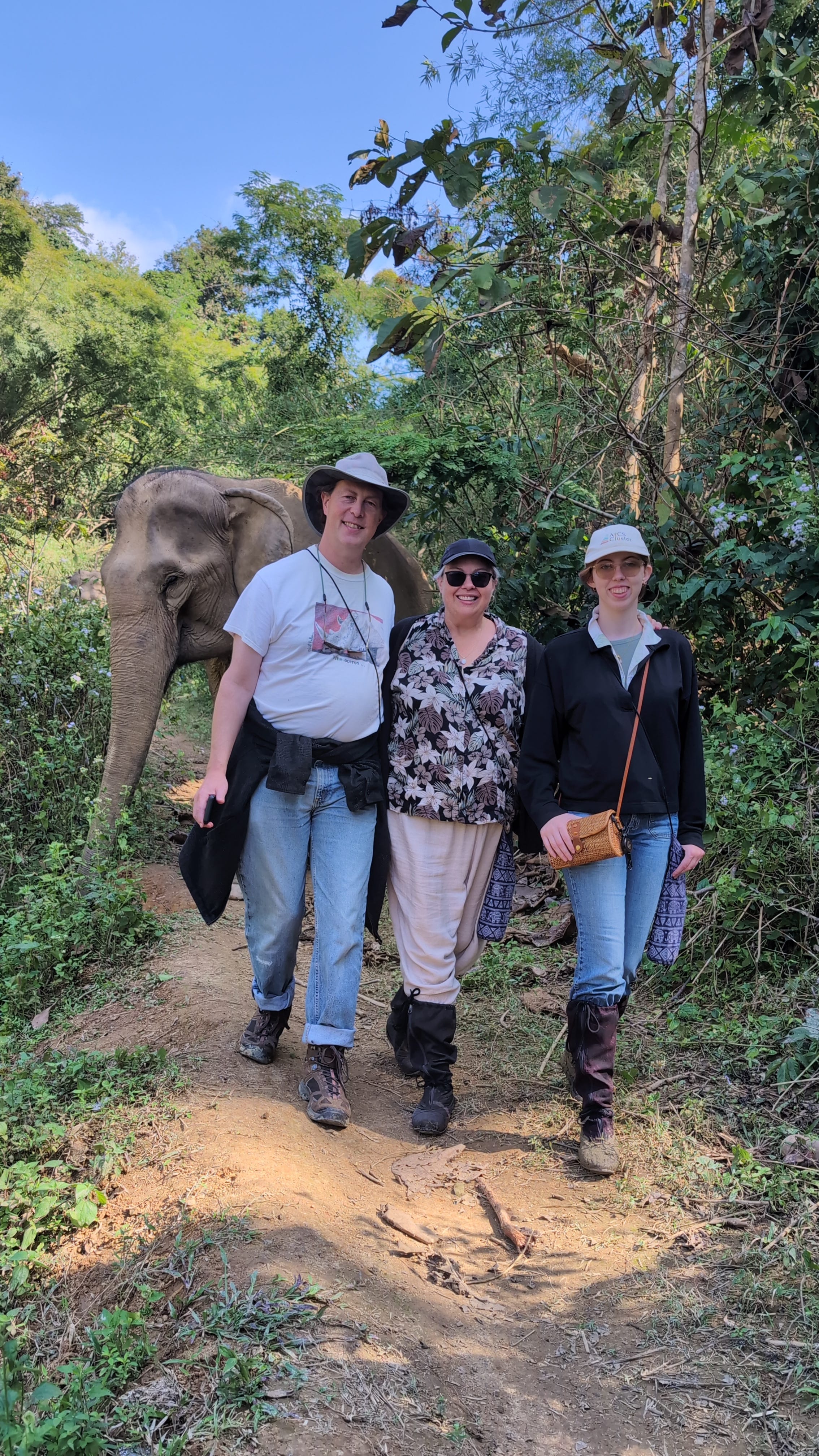 We walked some very muddy trails into the jungle to meet up with Than and San, two of the elephants in their care. While elephants move surprisingly quietly when walking, they make plenty of noise when they're eating their way through a stand of bamboo, so they were fairly easy to locate. Eventually they emerged from the jungle and we got to see them.