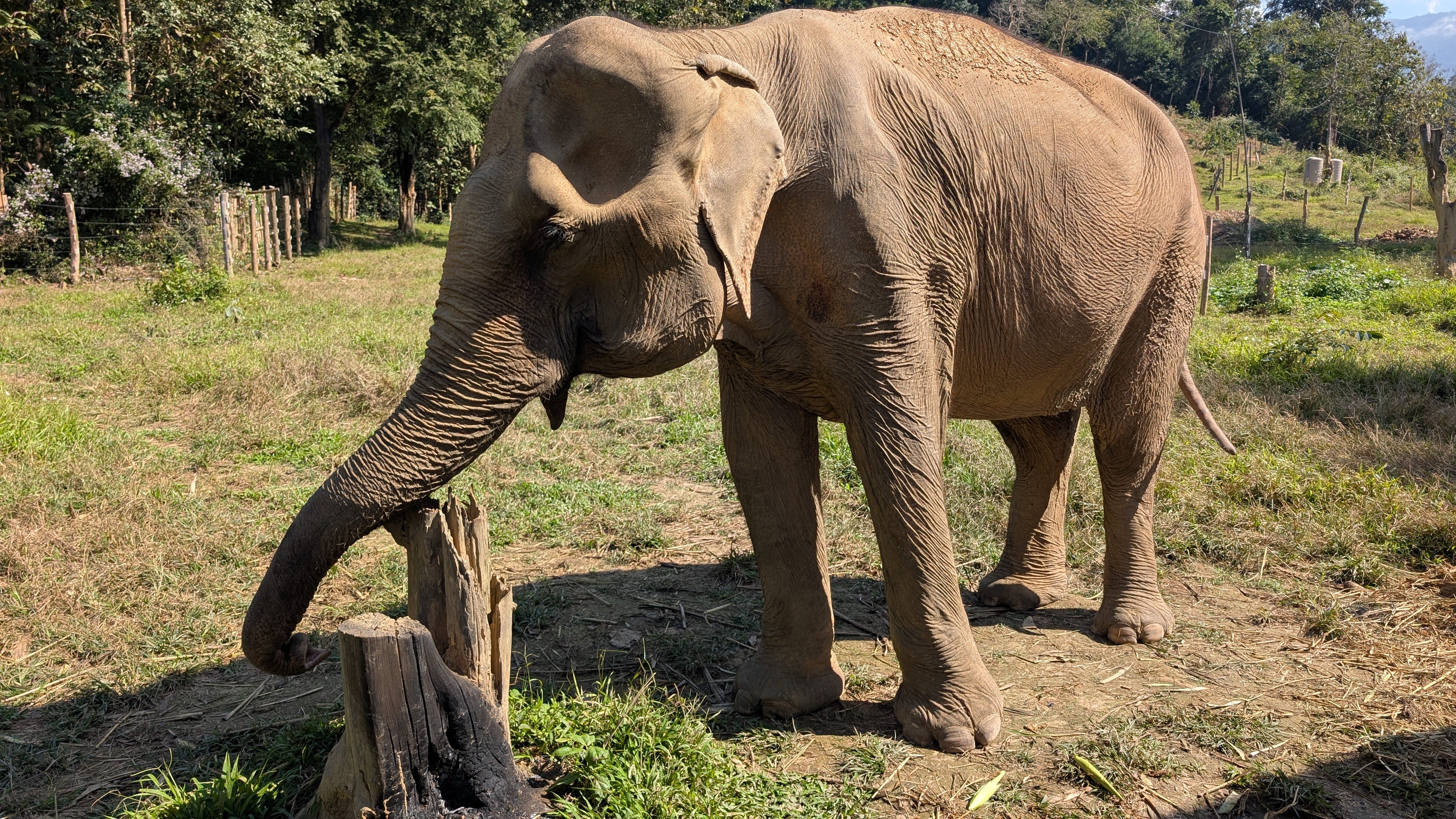 In the camp we saw a baby elephant at a distance. The project hopes to release the young elephants into the national park further north once they are of an age to leave their mothers. We also met Sankin, who is their oldest resident at 72. She is a devoted auntie to the new babies.