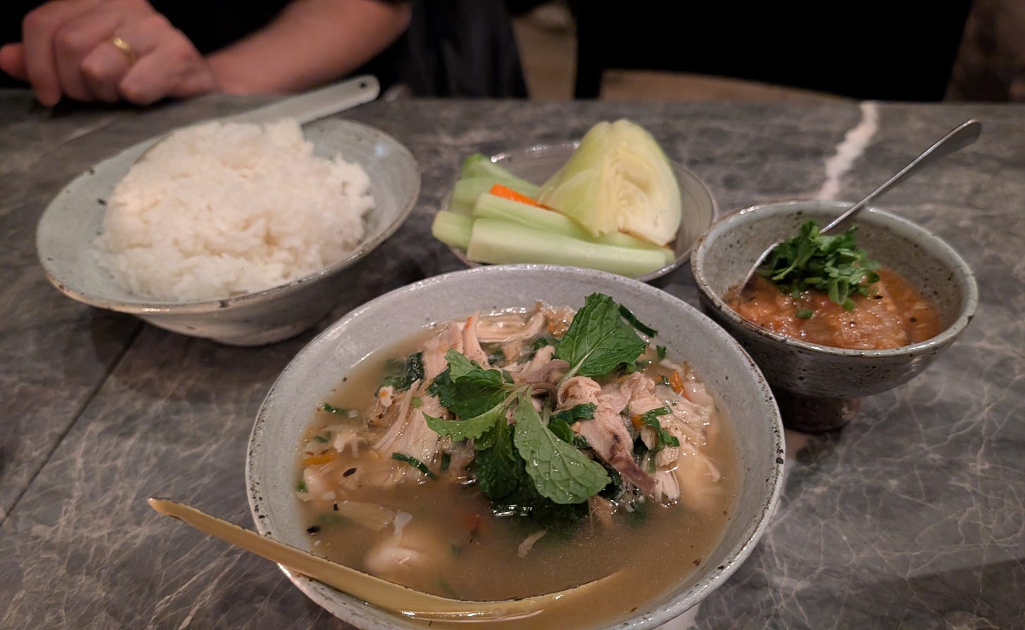Jeow bong is the staple condiment and each family has their own variation. Little Lao offers a dozen choices and we picked the mak len (on the right) made with sun-dried tomatoes, chilies, and galangal. It comes with sticky rice and lightly steamed cold vegetables. We also had the suup gai, a very mild and soupy chicken curry that I liked very much.