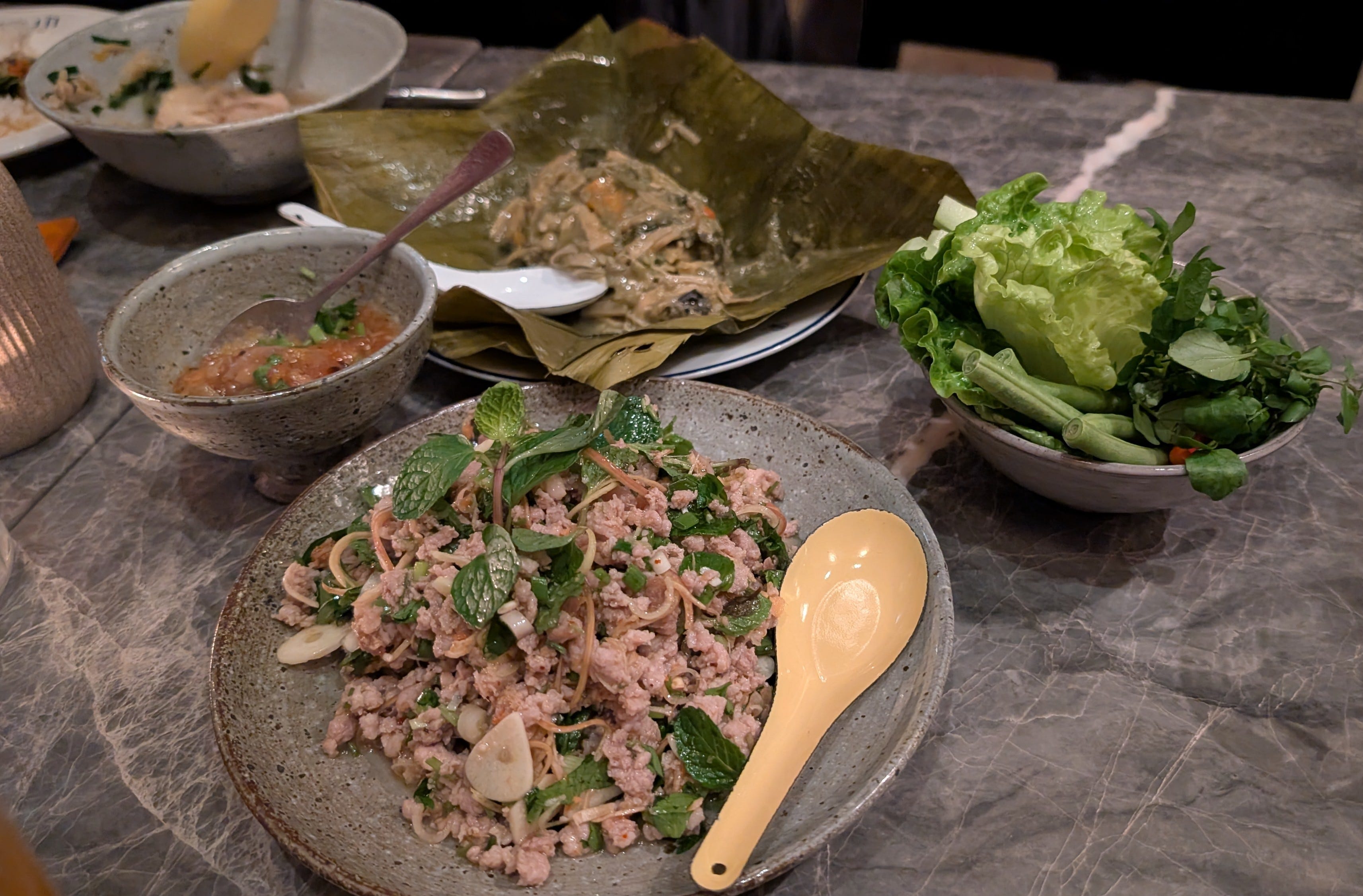 The second round of dishes included mok nor mai (seasoned bamboo shoots and herbs mixed with pork belly and steamed in a bamboo lead) and laab moo (spicy minced pork tossed with toasted ground rice, lime juice, fish sauce, and various herbs and aromatics). Everything was delicious--Lao food is definitely my favorite discovery of the trip!
