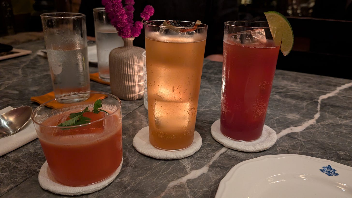 Their menu was a whole book about the traditions of Lao cooking. We started with drinks featuring local ingredients. Mine (in the middle) was gin with bael fruit juice and soda, and very tasty.