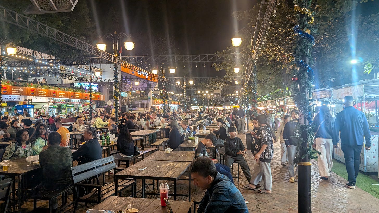There is a large plaza of tables surrounded by food stalls that smelled great, but we had another plan for dinner.