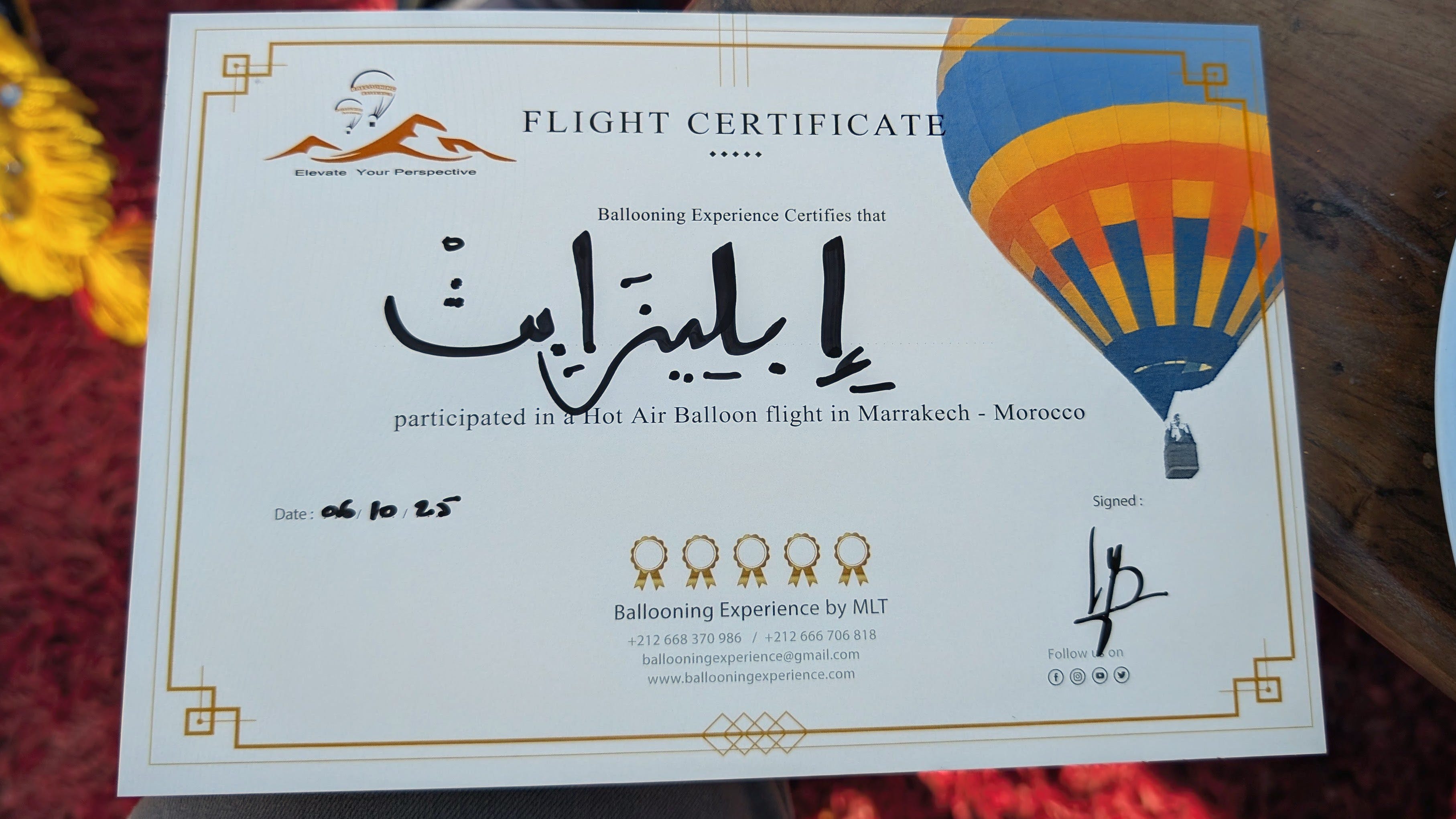 Yusuf came around to ask how we'd enjoyed the ride and to fill out flight certificates. I asked him to write my name in Arabic.