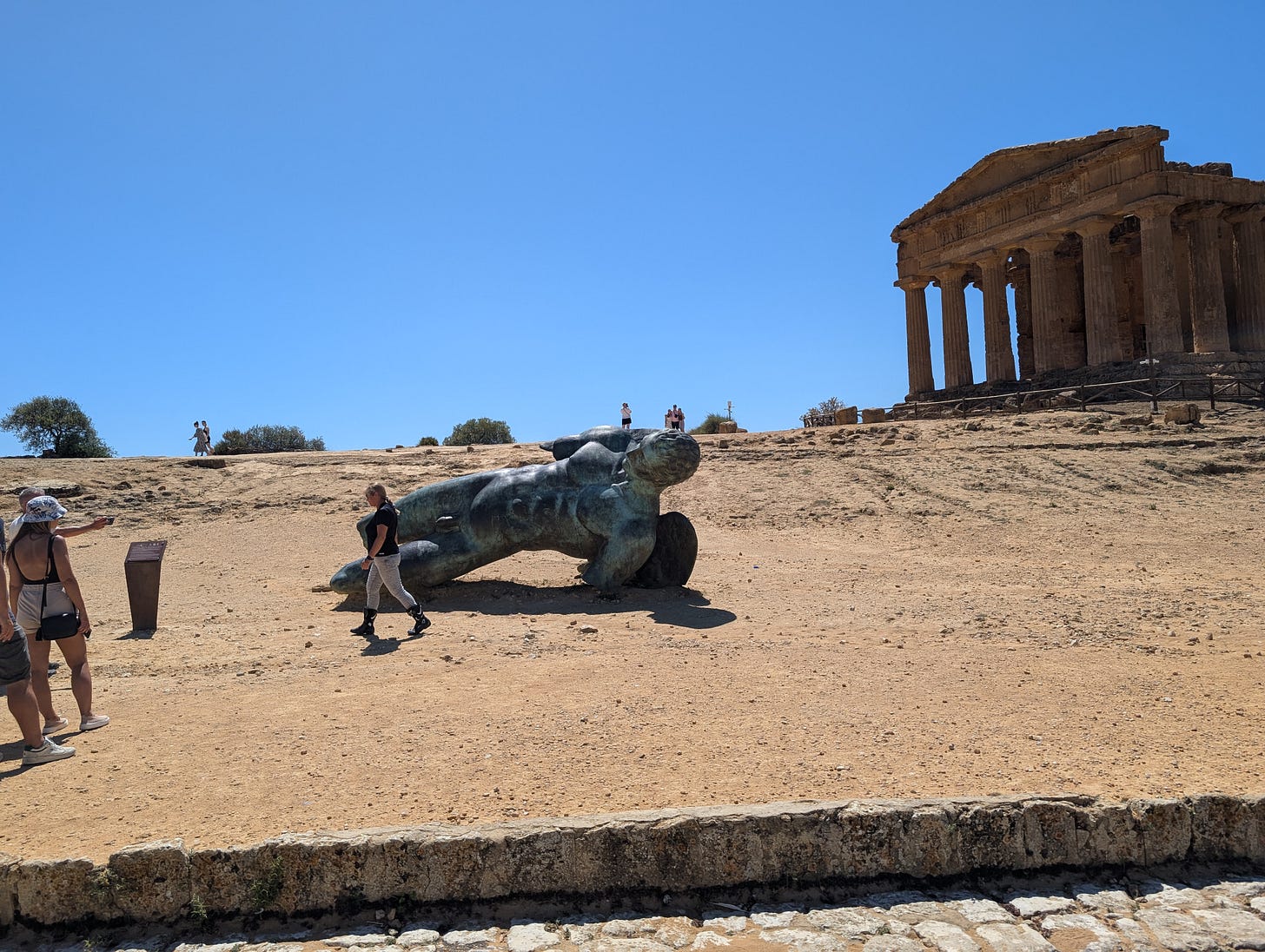 We were so happy to board the shuttle that would return us to the start of the path. Along the way we got a good view of the bronze statue of fallen Icarus lying on the eastern side of the Temple of Concordia.