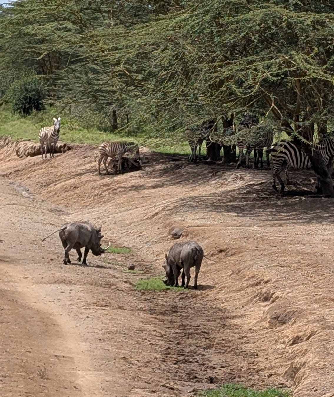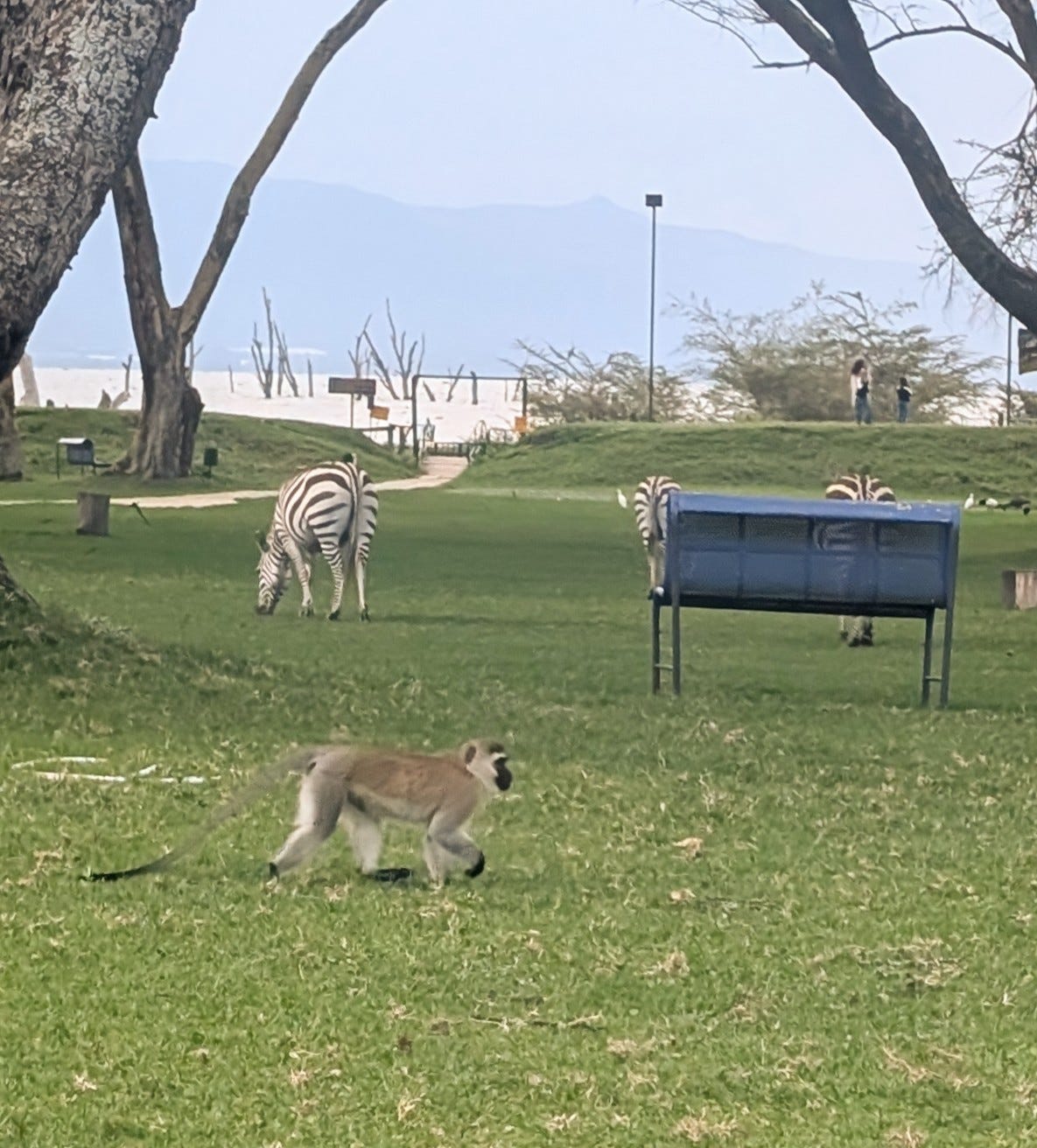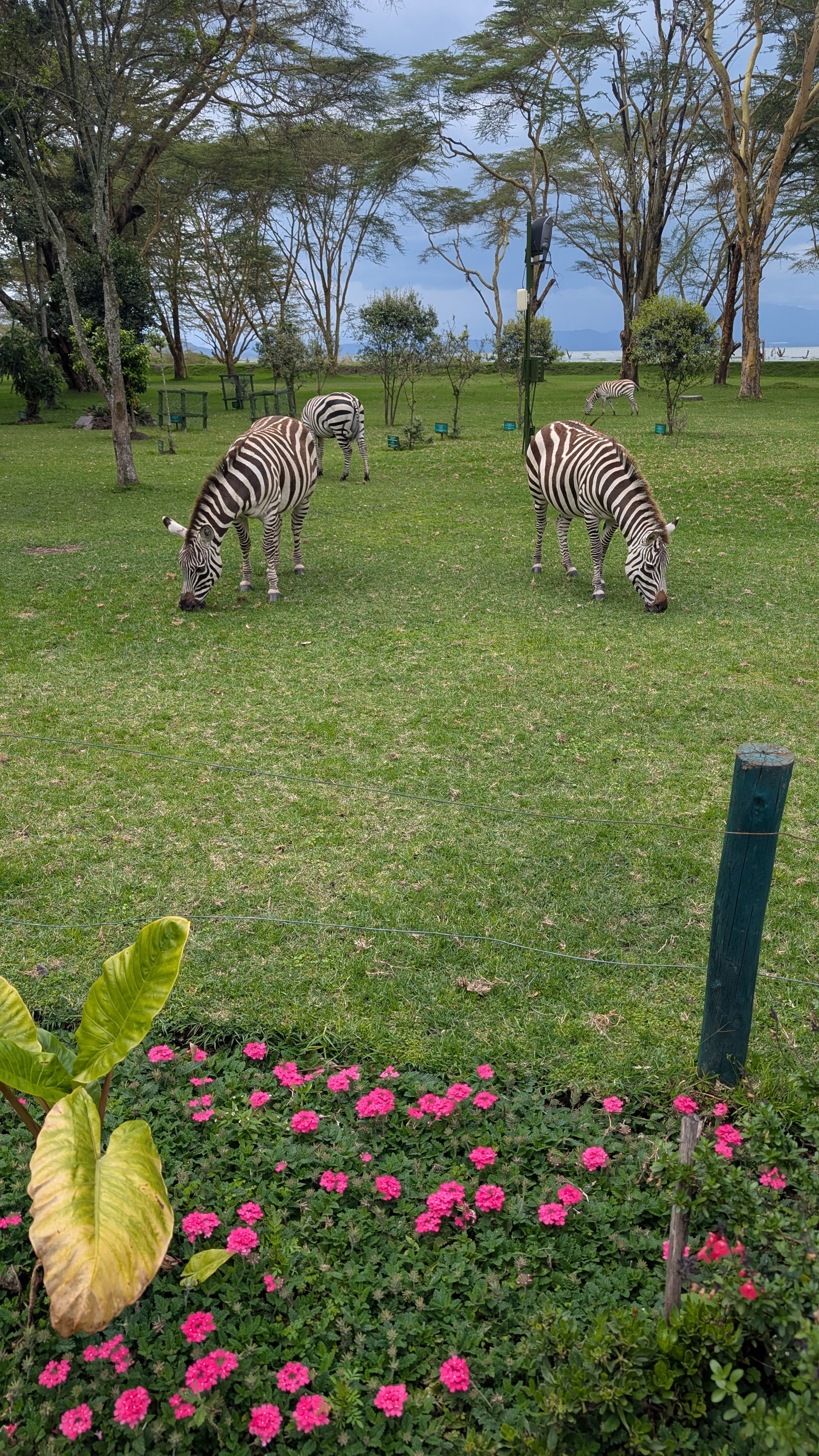 Tom did a great job of navigating all that, plus accidents and construction delays to get us to Lake Naivasha Simba Lodge before the lunch buffet closed at 2:30pm. The lodge has various animals wandering the grounds and this is the sight that met us as we walked to our room.