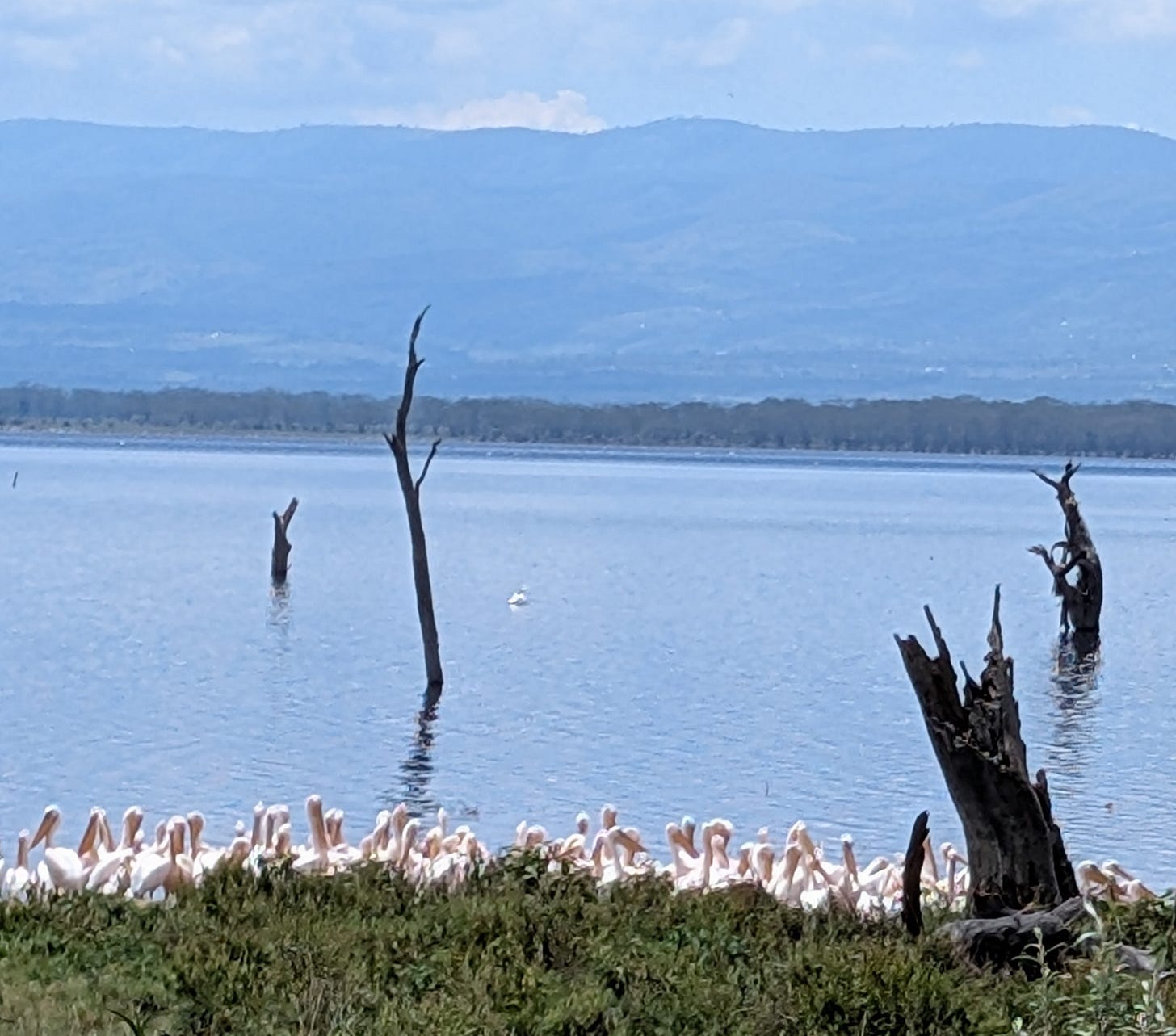 The lake itself is highly alkaline, so there is not a lot of life in it. It used to be famous for throngs of flamingos, but the rising water levels have made it too deep for them to wade. But there are enough fish to make it attractive to a veritable flotilla of pelicans.