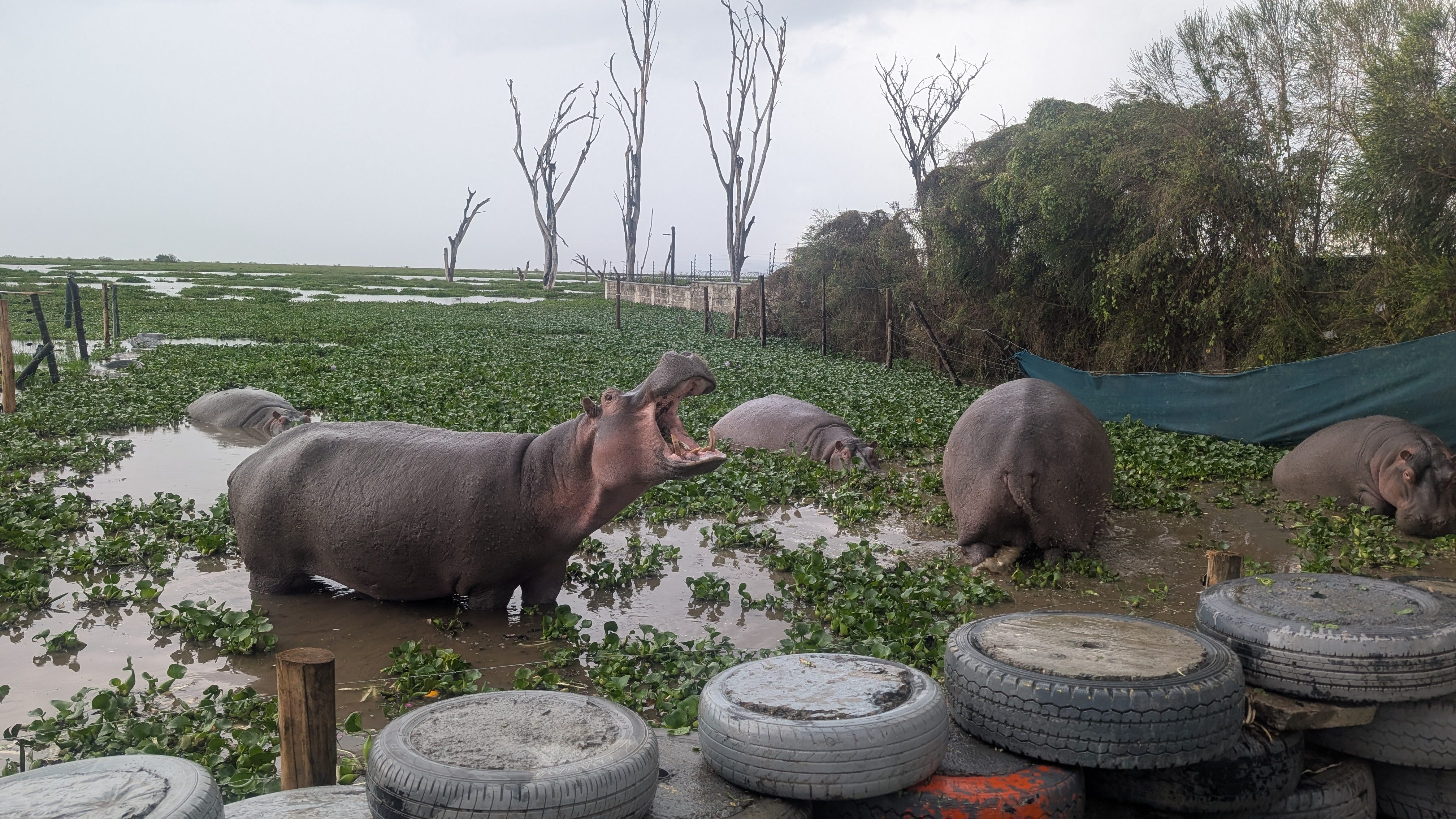 After a short break we got back in the truck and went back up toward town to Lake Naivasha Resort, where we had a boat ride scheduled. But by the time we got there, it was pouring, so no boat ride. But there were hippos!